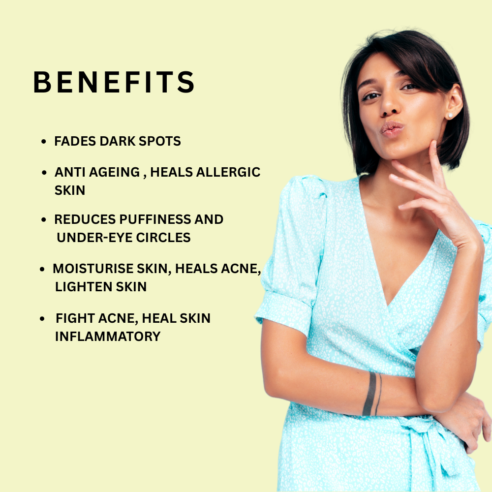 SOOTHES SUNBURN, FADES DARK SPOTS, MOISTURISING , ANTI AGEING , HEALS ALLERGIC SKIN, MOISTURISES AND FIGHTS BACTERIA, REDUCES ACNE , HYDRATES SKIN