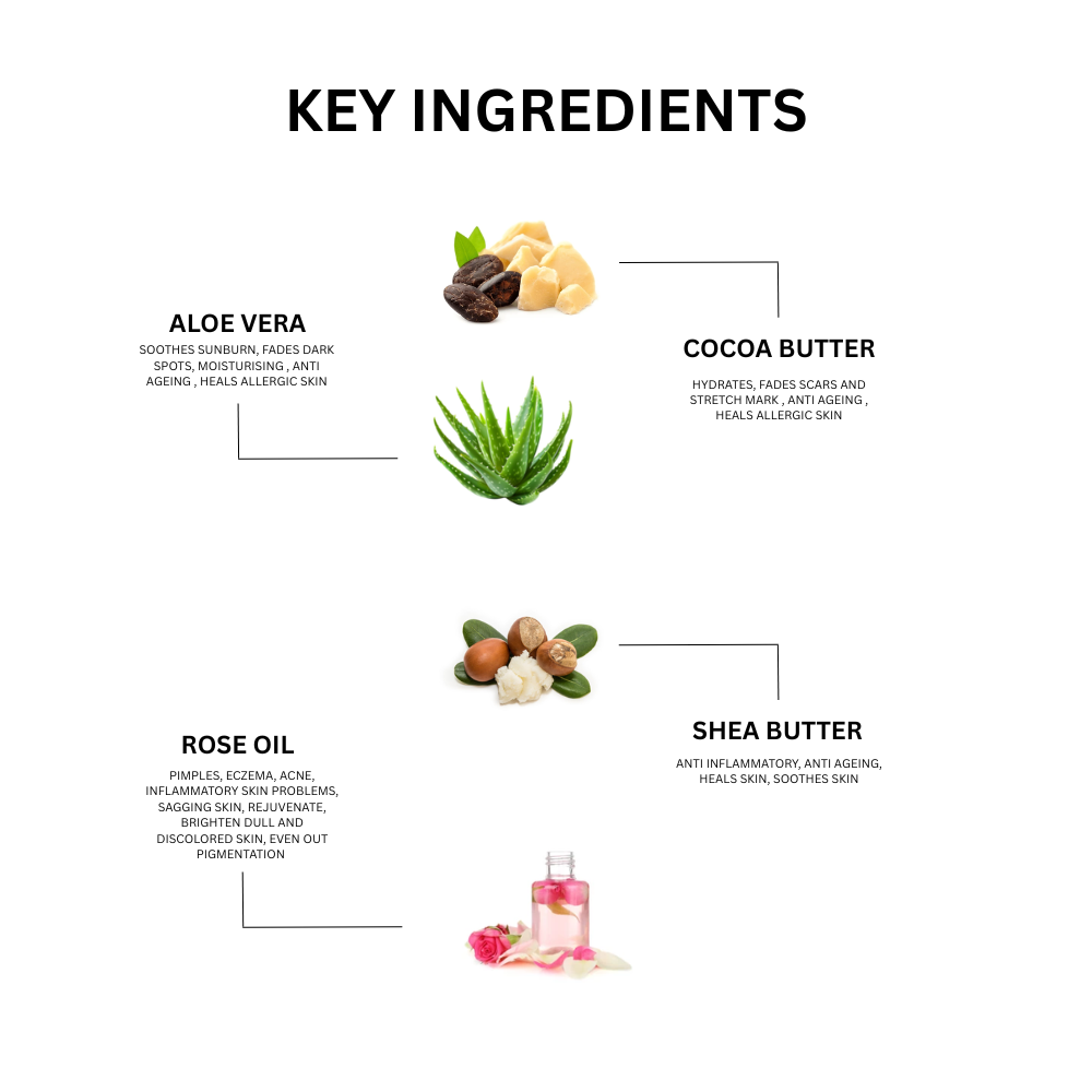 HYDRATES, FADES SCARS AND STRETCH MARK , ANTI AGEING , HEALS ALLERGIC SKIN,PROTECTS FROM SUN DAMAGE.