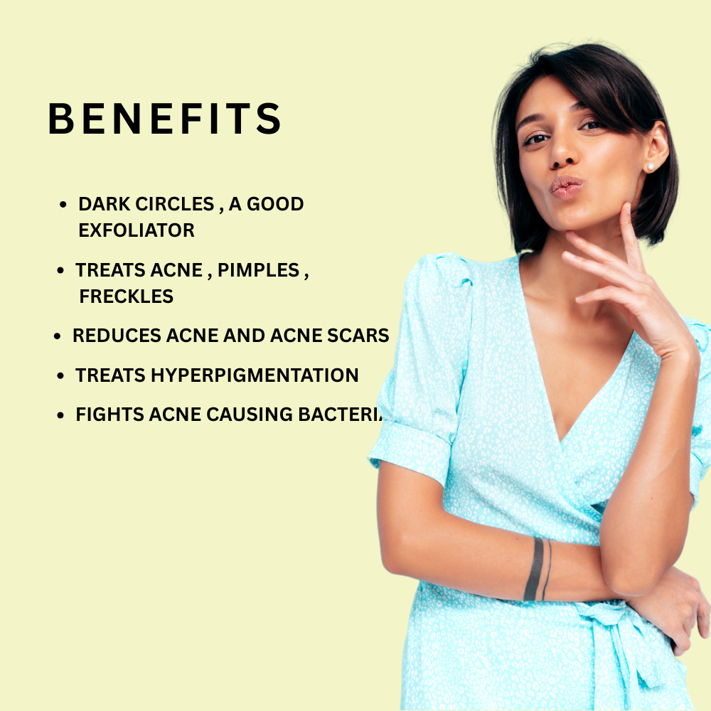 ANTI AGING, CAN REDUCE SCARS, FIGHTS ACNE CAUSING BACTERIA, REDUCES ACNE AND ACNE SCARS, REDUCES WRINKLES , FINE LINES , TREATS HYPERPIGMENTATION